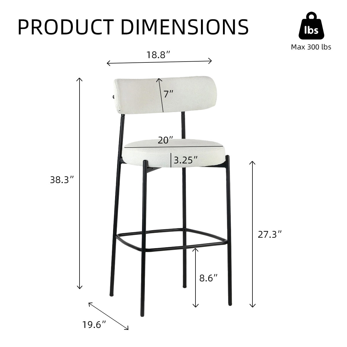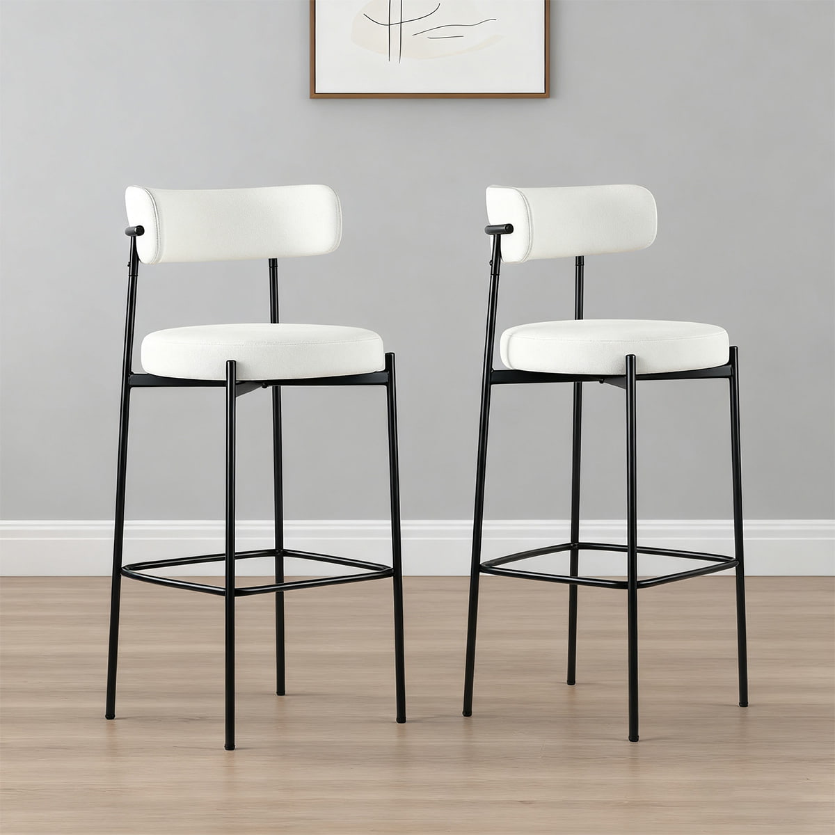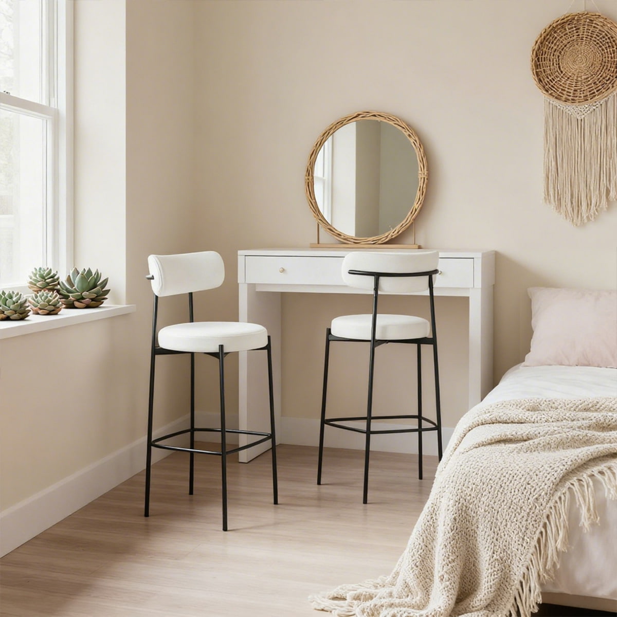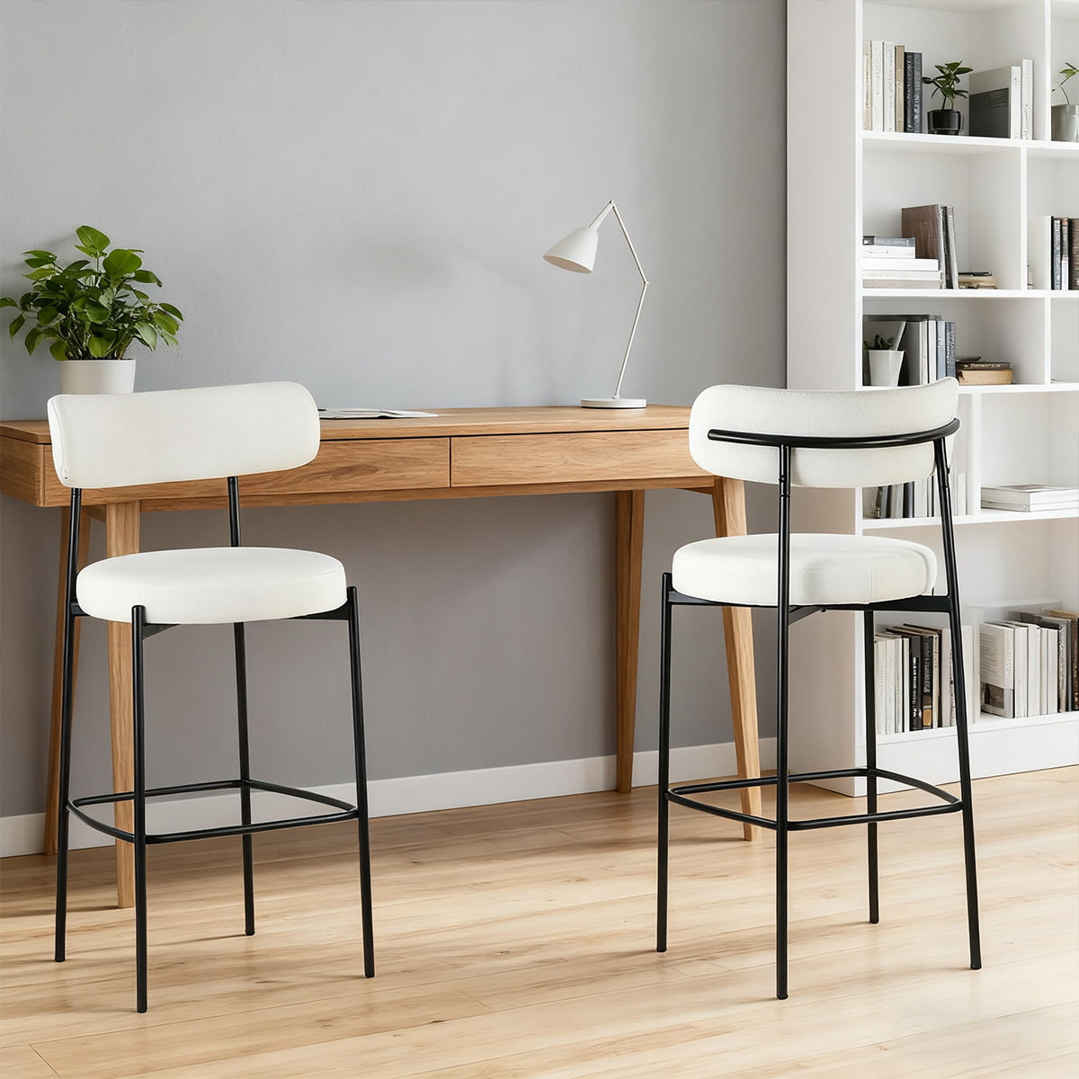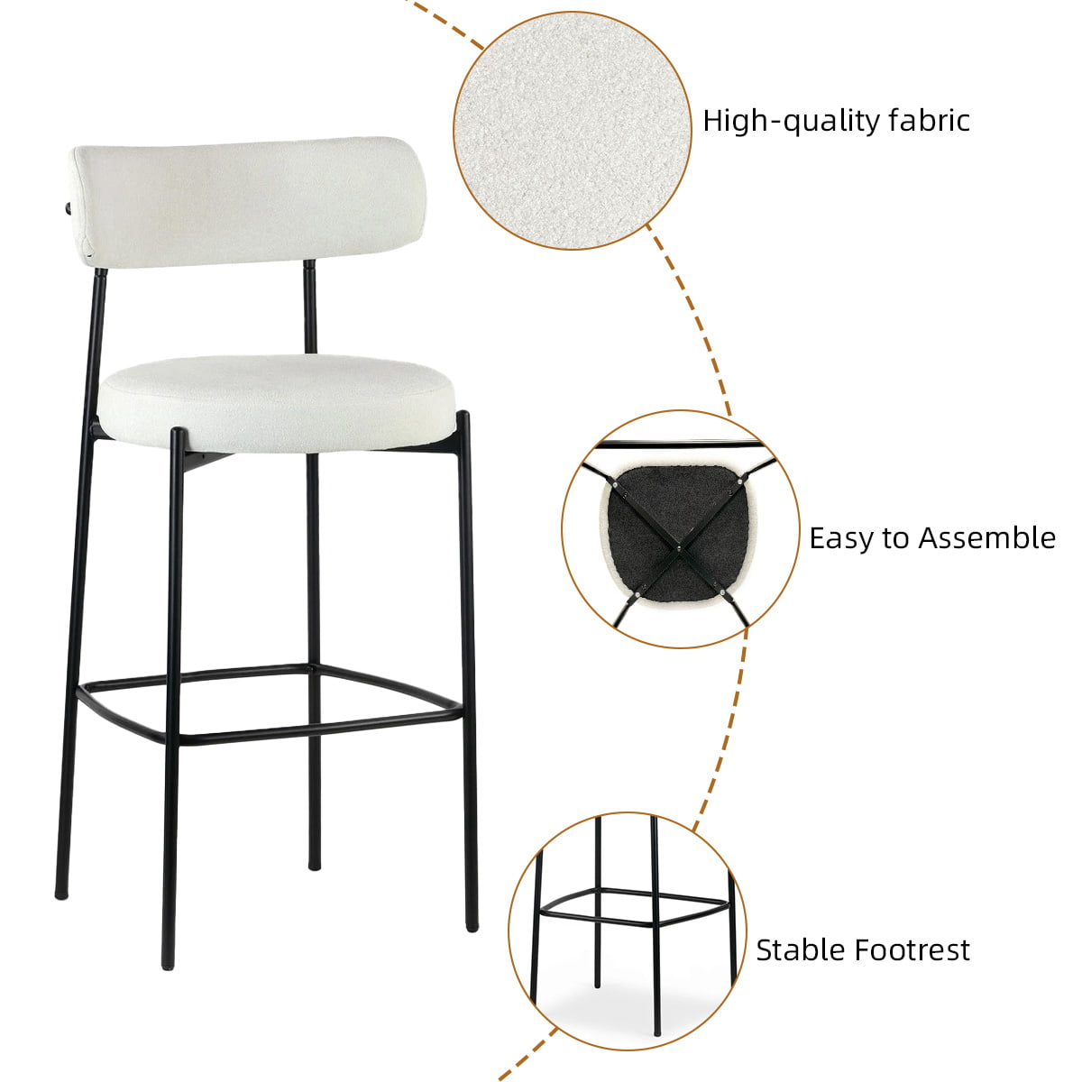 Ghế quầy bar Bouclé màu trắng hiện đại có chân kim loại màu đen — Ghế quầy bar bọc nệm có tựa lưng và chỗ để chân cho Đảo bếp, Phòng ăn và Quầy bar tại nhà