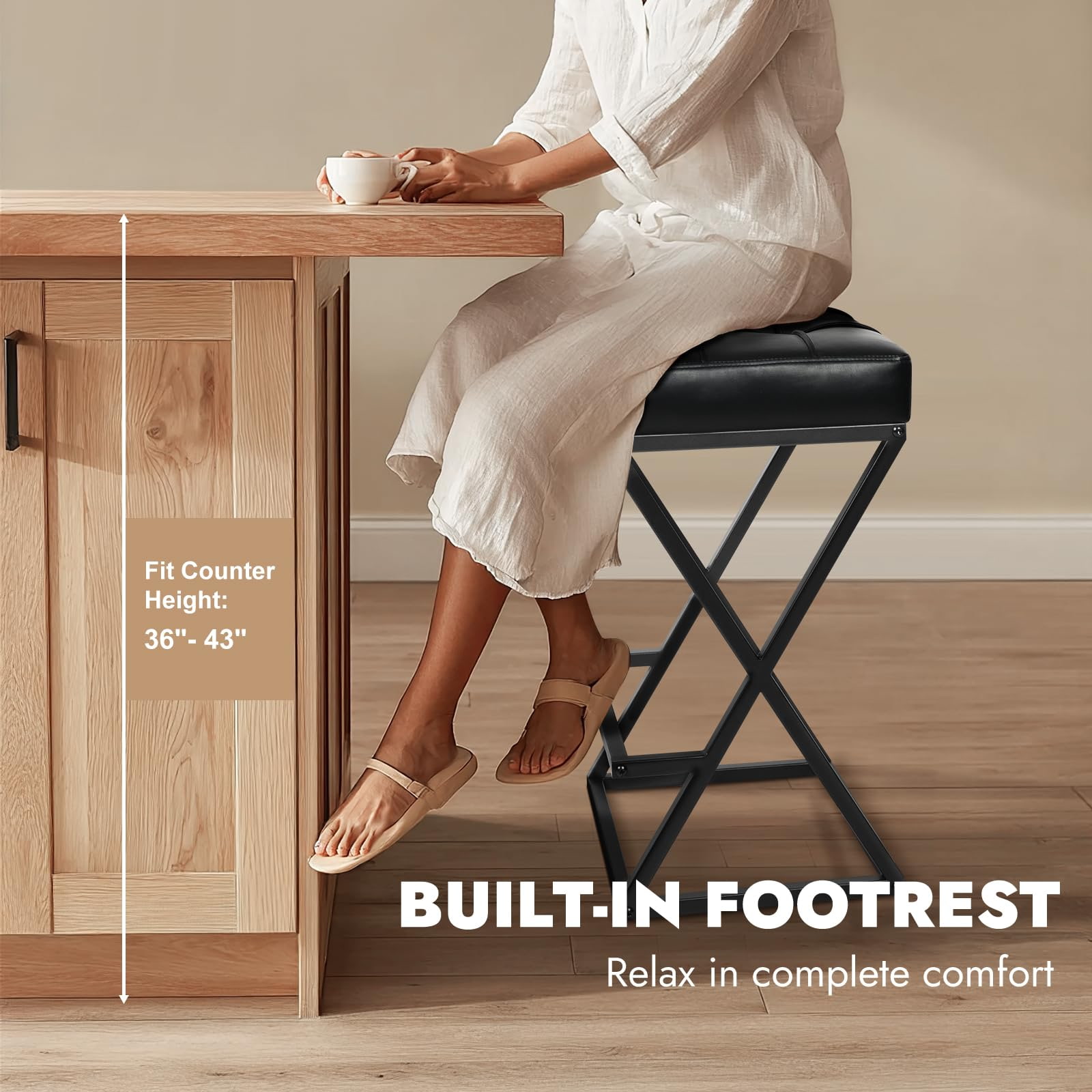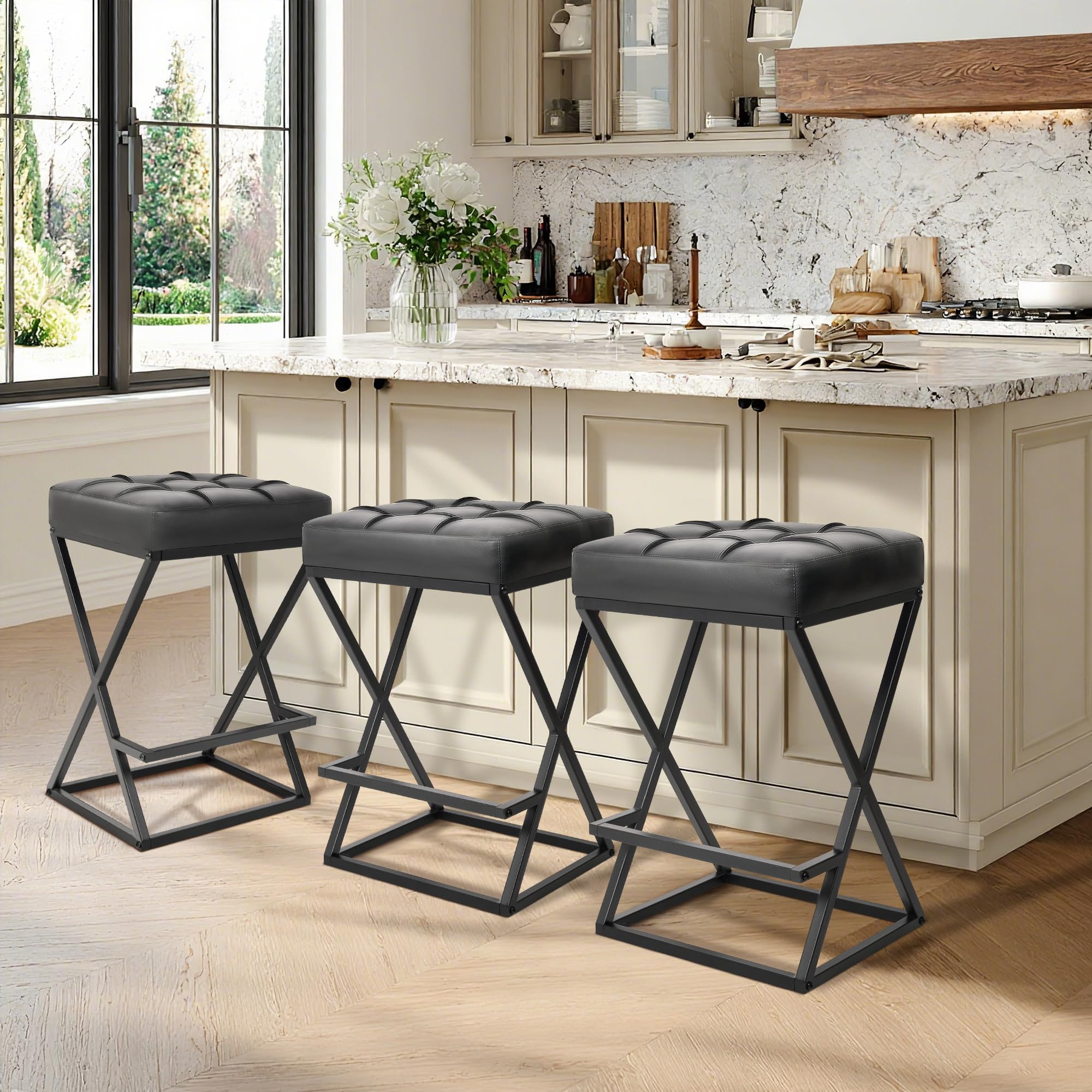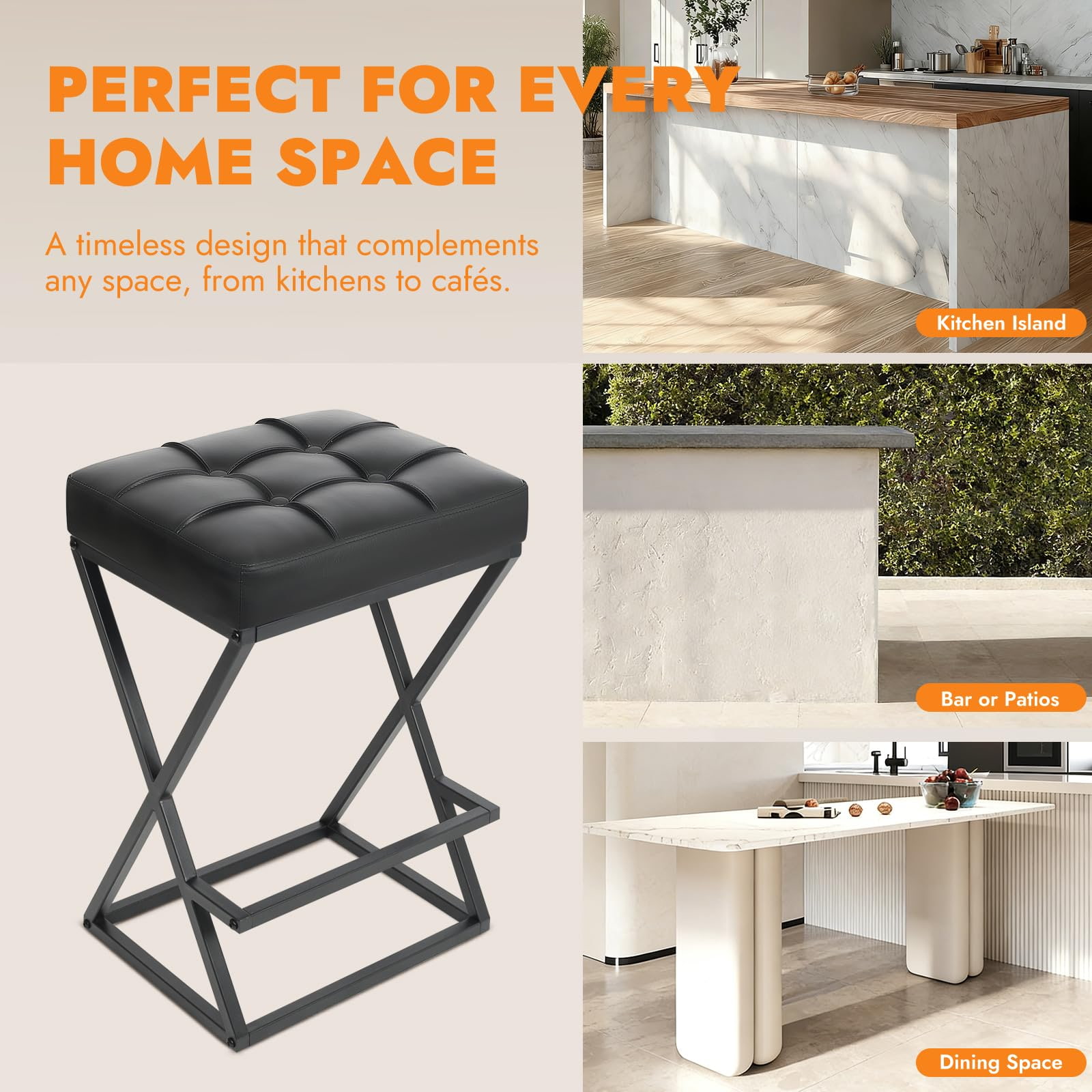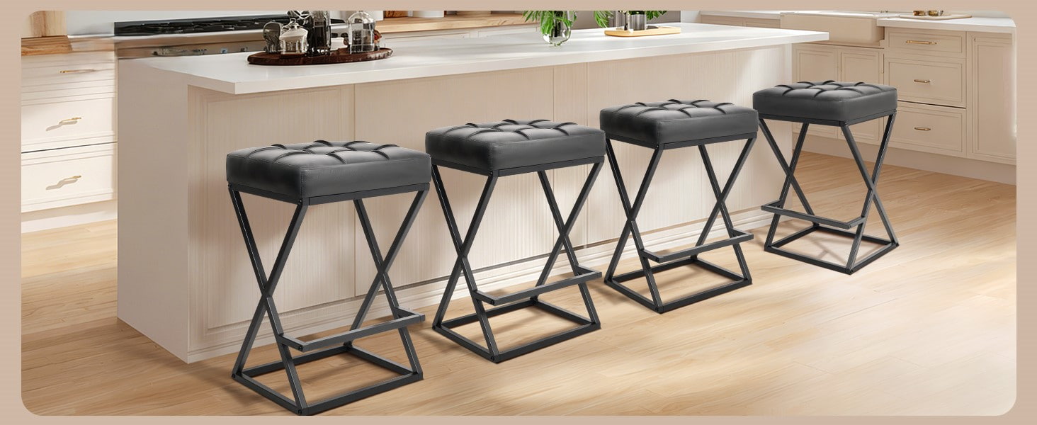 Ghế quầy bar không lưng tựa có chiều cao với ghế bọc da, khung chữ X ổn định bằng kim loại có chỗ để chân cho đảo bếp màu đen