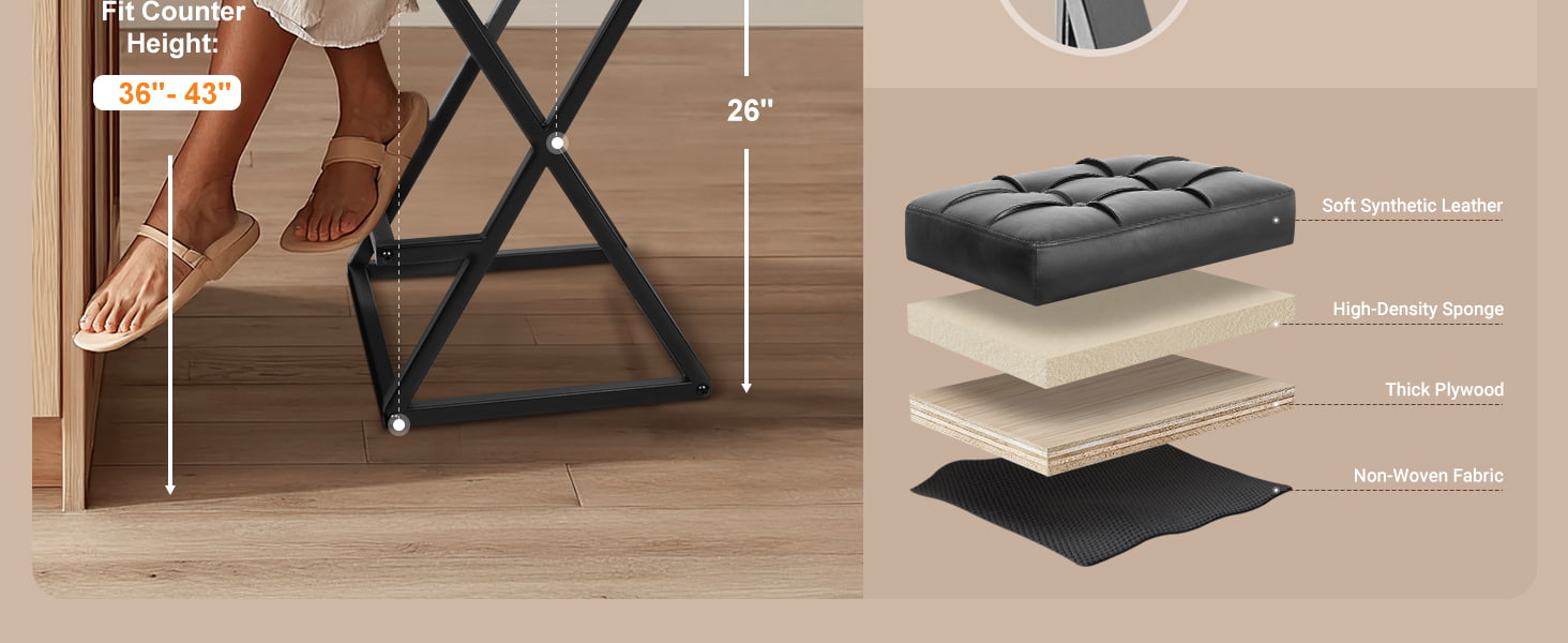 Được thiết kế cho cả môi trường dân cư và thương mại nhẹ, chiếc ghế quầy bar có lưng tựa cao này có cấu trúc kim loại khung chữ X được gia cố, ghế giả da đệm xốp mật độ cao và dấu chân nhỏ gọn lý tưởng cho nhà bếp, căn hộ, quán cà phê và các dự án khách sạn. Chiều cao ghế 26 inch phù hợp với đảo bếp và quầy bếp tiêu chuẩn, đồng thời thiết kế không tựa lưng cho phép ghế trượt hoàn toàn bên dưới, tối đa hóa không gian sử dụng.