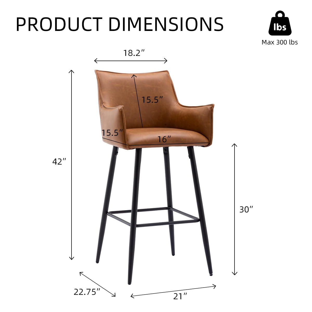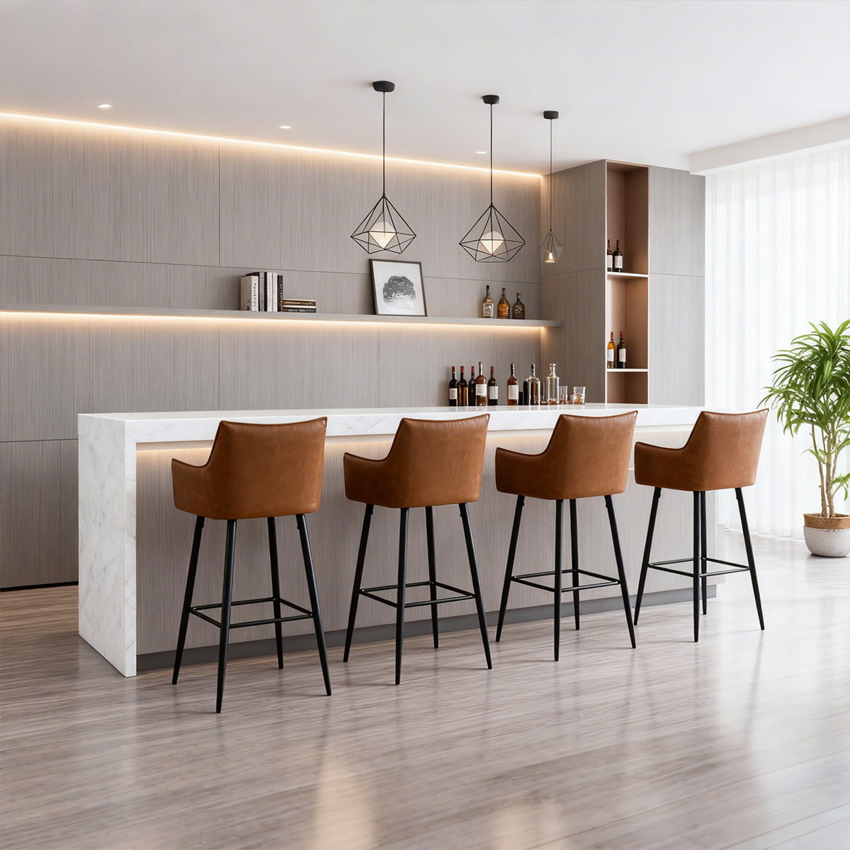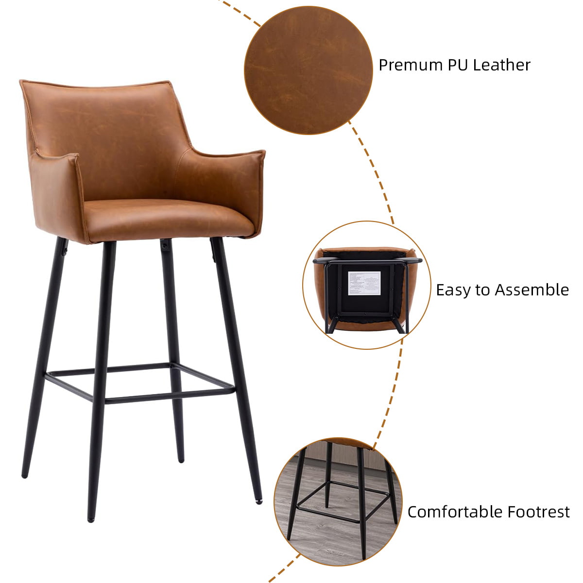 Ghế quầy bar bằng da PU màu nâu hiện đại có tay vịn & tựa lưng - Ghế quầy bar bọc nệm cao cấp có chân kim loại màu đen cho Đảo bếp, Bistro hoặc Home Bar